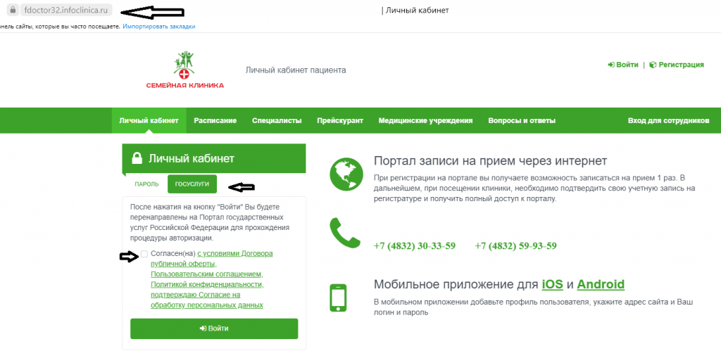 Процедуры, приемы врачей осуществляются по предварительной записи, а так же доступны пациентам в порядке живой очереди, в случае наличия свободного времени в расписании приема.Уточнить информацию о графике приема врачей, процедур, справочную информацию можно в онлайн-расписании (личный кабинет пациента в веб-версии на сайте fdoctor32.ru , так же в мобильном приложении Инфоклиника для ANDROID, IOS).Медицинское обслуживание возможно: